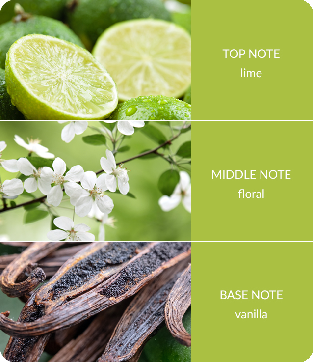 Uplifting and effervescent lime is tempered by creamy vanilla for a vibrant yet soothing scent to be positively savoured.