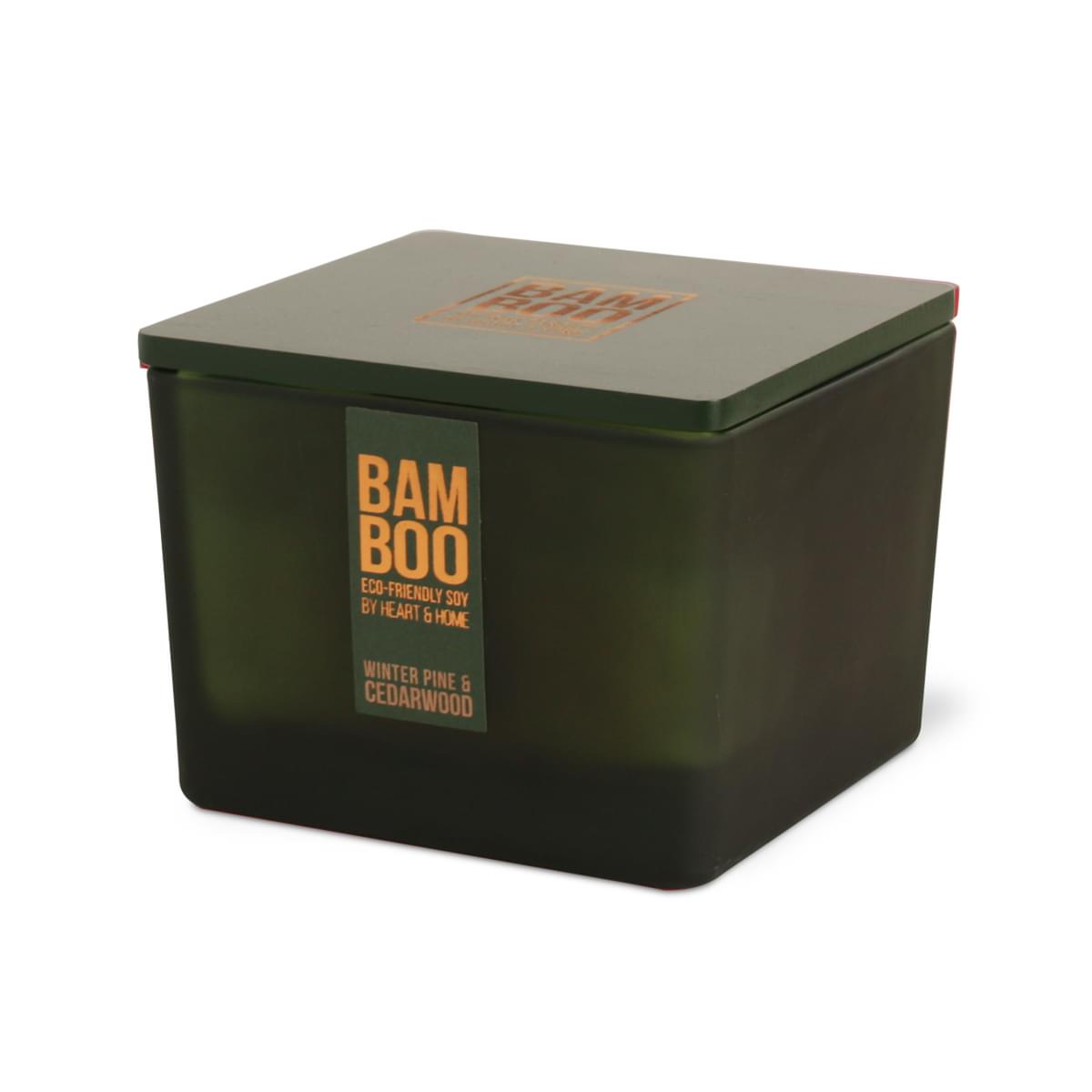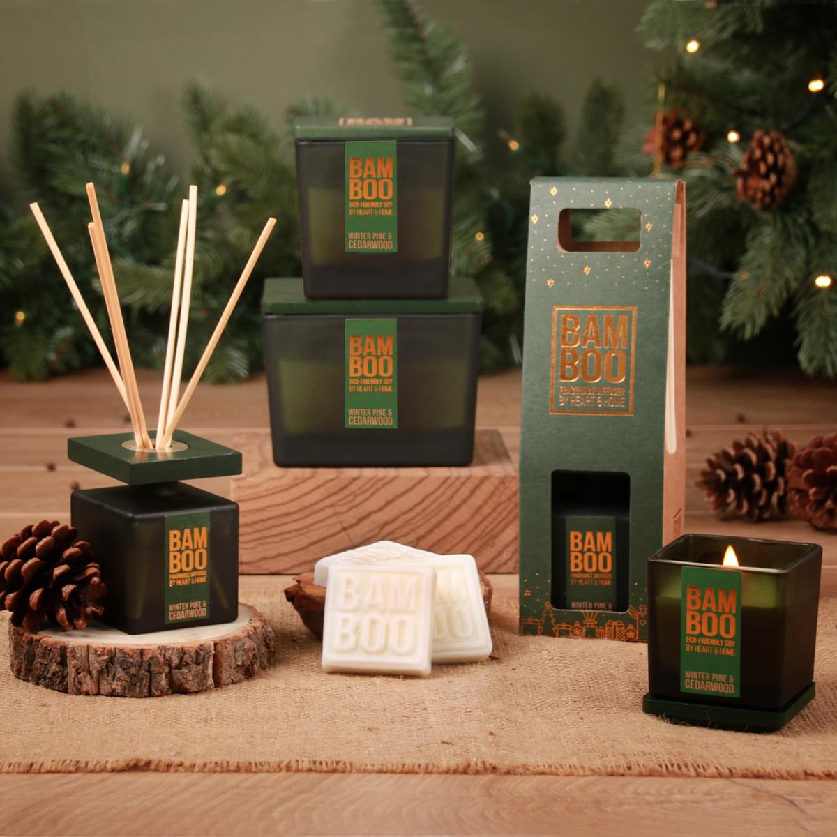 Bamboo centrepiece candle by Heart & Home. With a truly contemporary feel, this beautiful boutique coloured frosted glass candle features hand-poured pure white soy wax containing glorious natural essential oils. Savour the scintillating scent whilst listening to the subtly soothing crackling of the responsibly sourced wooden wicks. Not only does the gorgeous unsealed bamboo wood lid offer easy access to the candle but also makes the perfect coaster on which to sit your Bamboo candle – an added eco-friendly bonus!The evergreen fragrance of Christmas fir trees and sweet winter spices are wrapped together in this magical festive aroma.